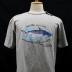 เสื้อยืดแขนสั้นสีเทา ด้านหน้าสกรีนภาพปลาบึก พร้อมข้อความว่า "ปลาบึก (PLA BUK) คณะเทคโนโลยีการประมงฯ Maejo University www.mju.ac.th)